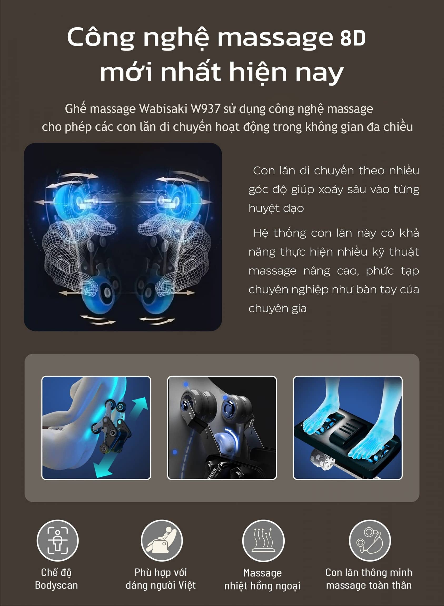 | Công nghệ massage | Công nghệ massage 8D+ bi lăn di chuyển |